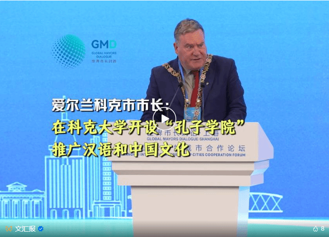 5月29日,世界市长对话·上海暨2025年上海国际友好城市合作论坛在沪举行。爱尔兰科克市市长丹·博伊尔在论坛发言中充分肯定了上海大学与科克大学合作共建的科克大学孔子学院在当地发挥的积极作用。博伊尔市长表示,科克孔院积极“推广汉语和中国文化”,“为年轻人提供了全球商业环境的重要语言技能”。